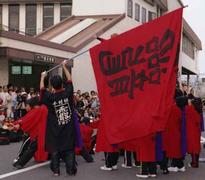 ホームページ更新 2002年2月3日(日) 雨 昨年8月のバサラ祭り。西大寺駅前で最初に踊った"今村組"はこの1枚だけだった。 |
