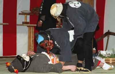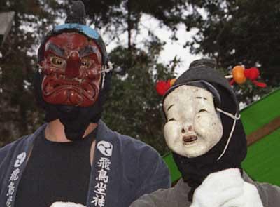 ホームページ更新 2002年3月10日(日) 晴 飛鳥坐神社の"御田祭り"の一連の所作が終わったあと、天狗とお多福。 | ホームページを更新。飛鳥坐神社の"御田祭り"の写真をアップロード。ディスク使用率が9.36%に。まだまだ余裕がある。 | |
