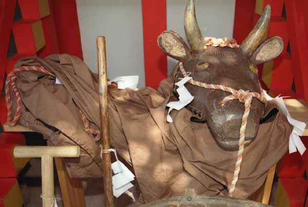 スキャン開始2 2002年6月24日(月) 晴/曇 こちらは祭りも酣となって登場した牛。 | 左の写真は、昨日に続き、鏡作神社の御田祭の牛。2002年2月。 | |