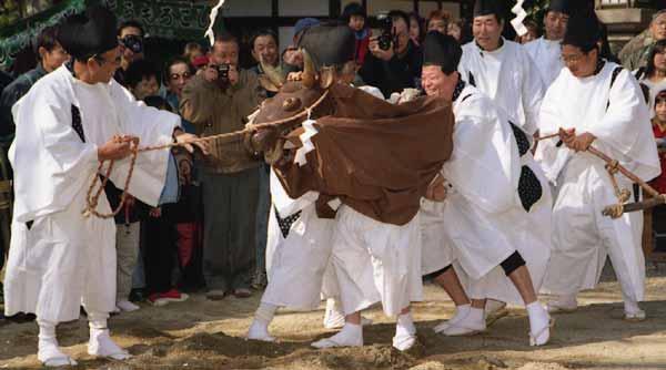 御田祭り(鏡作神社) 2002年2月24日(日) 晴 | 今日は、"御田祭り"のある鏡作神社(田原本町)へ。早乙女の舞の後、農作業を模した牛と人とのユーモラスな所作が行われた。明日は菅原神社の"御田祭り"。 | |