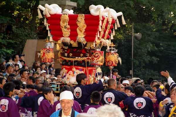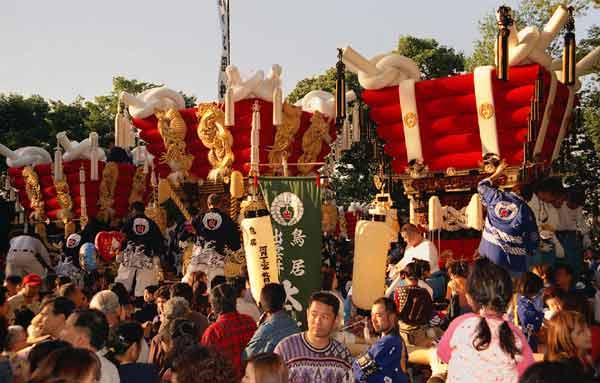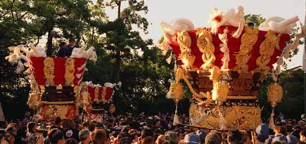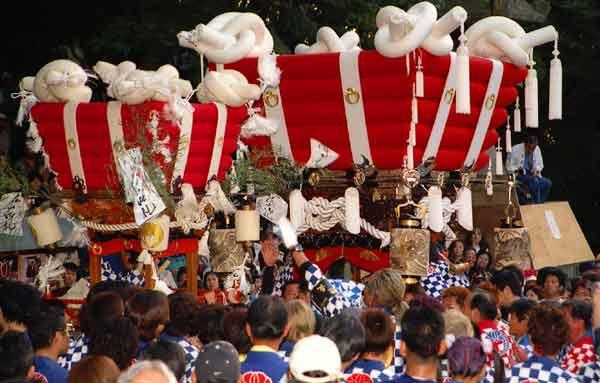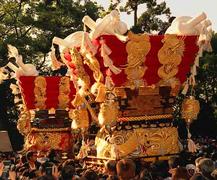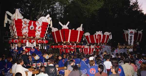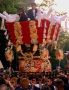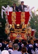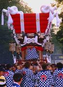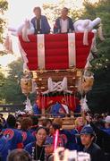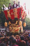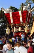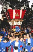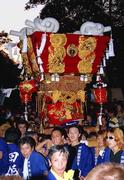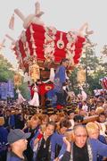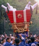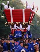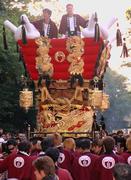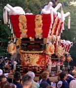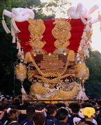枚岡神社秋祭り36 2002年10月17日(木) 晴 枚岡神社秋祭り(東大阪市)。布団太鼓が拝殿下の広場へ集結。2001年10月。 | さっきまでTVで、岸和田市(大阪府)・別所町に於ける40年ぶりのだんじり(一般的な名称は山車だが大阪ではだんじり。京都の祇園祭りでは山鉾。秩父では屋台・傘鉾。)の復活に関する番組をやっていた。何から何まで事実上初めてだったが、ともかく広い世代の男達の協力でだんじりが晴れて動くまでの物語であった。枚岡神社秋祭りでも、神社前の道路にだんじりが置いてあった。そもそも筆者が祭りの写真を始めたのは、川越市(埼玉県)の山車の祭りを見たが故であった。しかし最近では半田市の山車を見ただけだ。もっと山車に浸った暮らしがしたい。 | |