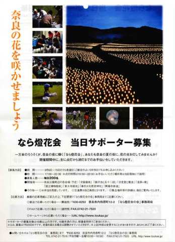 今日は曇後、夜から雨。写真は"なら燈花会"ボランティア募集のポスター。毎年夏、奈良公園とその周辺、即ち春日神社や浮御堂、東大寺鏡池等では盛大に蝋燭を灯しているが、これがなら燈花会。丁度、高円山の大文字焼きや橿原市のほうらんや火祭りのある暑い時期だ。なお、なら燈花会のホームページはhttp://www.toukae.jpだ。なお、手元のパソコンにも会社と同じように、netscapeをインストール。社内の業務登録関係のホームページには、netscapeでなければ(と言うよりIEでは)アクセス出来ない所もある。普通のホームページでは、先ずそういう所は無いと思うが、自分のホームページの作法がIEに偏しない目的も込めて、念の為。