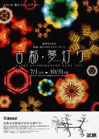 今日は薄曇のまずまずの1日。街中の某カメラ店へ寄った所、最近発売になったばかりのカメラ振れを補償する機能を持ったAF Nikkor24-120/3.5-5.6Gが1本、デモ用としてNikon D100に付けてあった。Nikon D100の隣にはフルサイズ機Kodak DCSPro14n。筆者は是非、フルサイズ機と思っているが、これは画質の為ではなく、最近の広角側が28mm乃至24mmから始まる高倍率ズームの能力を存分に享受する為である。しかし価格は約3倍。これでは買う気にならない。さて写真は奈良の夏のイベント"古都・夢灯り"のパンフレット。明日7/1から10/31まで奈良市の観光拠点、即ち猿沢池・興福寺五重塔・春日大社一の鳥居・奈良国立博物館・浮見堂・円窓亭・仏教美術資料研究センター・東大寺(大仏殿/中門/南大門)・新公会堂・平城京朱雀門・薬師寺の夜間ライトアップが行われる。夜の祭りと言えば、だいぶ先になるが、8/6〜15にはなら燈火会、8/14・15には春日大社中元万灯篭、8/15には東大寺万燈供養会及び高円山大文字焼き。蛇足だが橿原市のほうらんや火祭りも8/15の筈。この頃の奈良は不夜城だ。