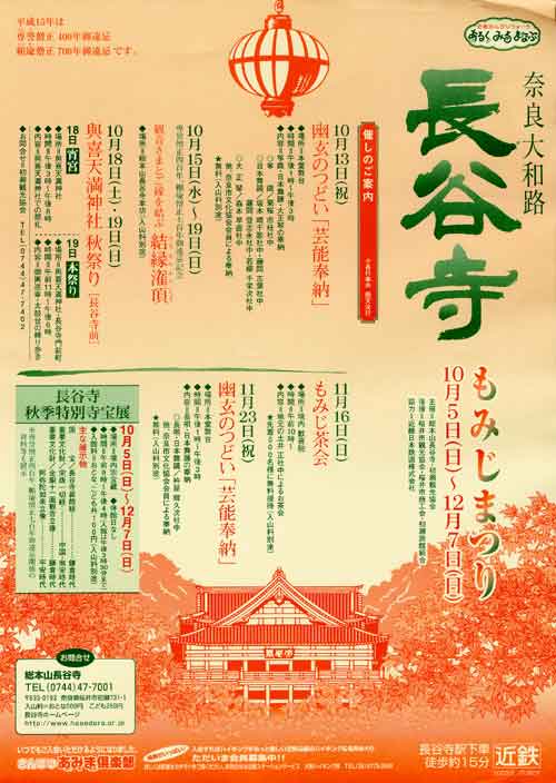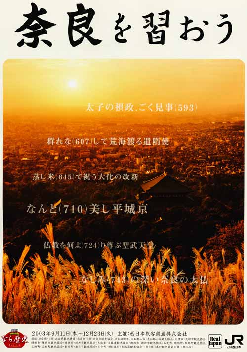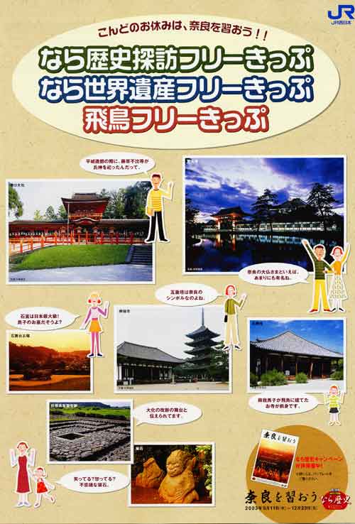 今日は晴。左の「奈良を習おう」はJRの観光案内だ。中心街にあって尚古い街並みの残る奈良町から奈良観光の中心・東大寺と奈良公園、そこから西へ歩いた佐保・佐紀路、唐招提寺・薬師寺のある西の京、日本発祥の地である飛鳥・桜井・橿原、剣豪の里野牛、じゃなかった柳生等、奈良県内各所の見所が出ている。それにしてもここ最近疲れている。やれやれ。そうこうしている内に、代用交換レンズメーカーTamronから待望の広角ズーム17-35/2.8-4の発売日決定の発表があった。10/21予定。従来の20-40/2.7-3.5に比べ、更に広角寄りになっているのみならず、デジタル時代を見据えて設計されている(筈だ)。Sigmaの類似製品とは正面衝突だ。