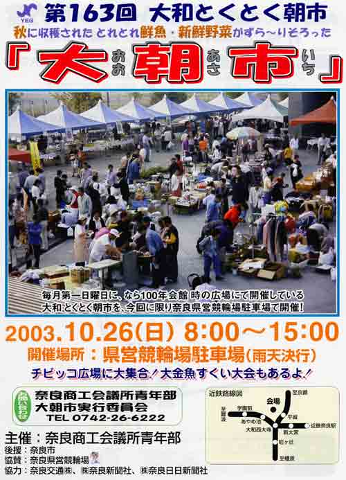 今日は薄曇。左は、第163回大和とくとく朝市「大朝市」。場所は県営競輪場駐車場、とあるから秋篠寺の近くか。さてこんな情熱的なナツメロがあった。南の薔薇そよ風に 微笑む君の姿 胸に抱き口付ける 花よ薔薇の花 美しの月の宵 共に盃上げ 君よ歌え 恋の歌を 悩ましこの胸 燃え立つ恋 南の国スペインの 君はやさしの薔薇 南の薔薇憧れの 君こそ花のクイーン 夢の間も忘られぬ 花よ薔薇の花 美しの月の宵 共に盃上げ 君よ歌え 恋の歌を 悩ましこの胸 燃え立つ恋 南の国スペインの 君はやさしの薔薇 題名・歌手は分かるかな。 また話しは変わるが、いよいよ秋祭りのシーズン。筆者は去年木津町(京都府)の太鼓台を見物に行ったが、町のホームページによれば今年の予定は以下の様だ。 ◆御霊神社:10/25(土)正午過ぎ/敬神組・拝神団の2基 ◆田中神社:10/26(日)午前10時頃/小寺・西町の2基 ◆岡田国神社:10/26(日)正午過ぎ/義友会・社町の2基 ◆大宮神社・若宮神社:11/3(月)午前9:30頃/西吐師・東吐師の2基 また太鼓台ライトアップが10/18(土)役場南公園で。敬神組・社町・小寺・義友会の太鼓台4基が登場する。 | |