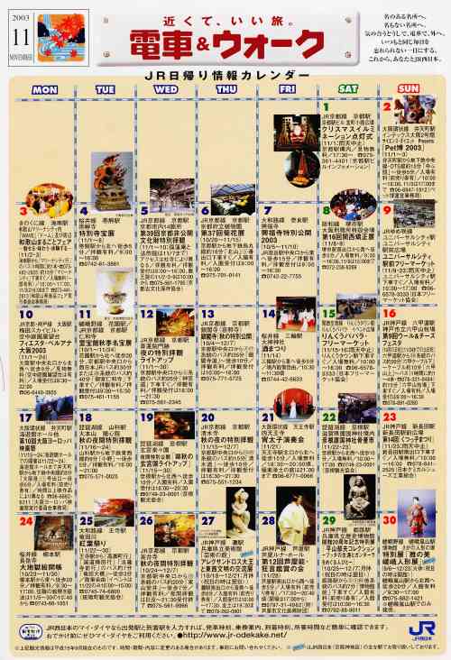 今日は晴だが、ここ数日帰宅が遅くなり疲れている。だから"THE ART OF USING YOUR WHOLE BRAIN"の話の続き(MBTIとの比較やFRの分析を行う予定)も一向に進まない。左はJRの沿線案内。祭・イヴェントや、この時期に相応しい紅葉の情報が出ている。ところで最近のInfoseekの動きだが、筆者も利用している無料ホームページの小窓式広告が廃止になった。cgi利用可能で50MBと大容量だから、めでたし、めでたし。他にバックグラウンドで動いているサーチエンジンとしてGoogleが採用されている。