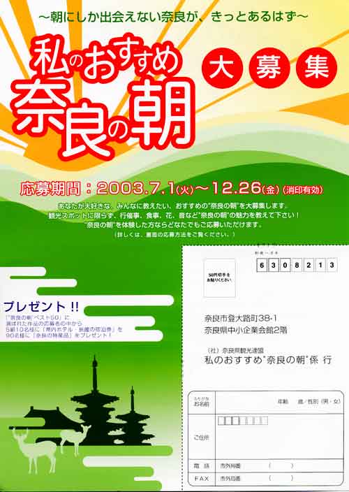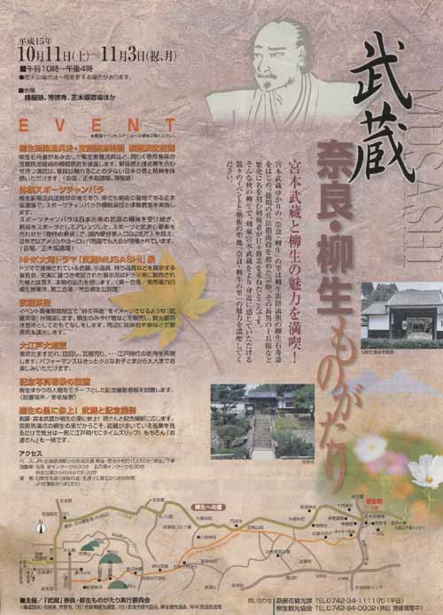 今日は晴。奈良から近い木津町(京都府)では太鼓台の祭があったが、日頃の疲れに加え午後から出勤した為見に行かず。左は奈良市東部の柳生地区の観光案内だ。ところで今日はホームページのディレクトリ構造変更。即ちfinito-webにあったばぁさんのホームページを筆者のホームページの下位ディレクトリへ移し、更にそこへばぁさんの日記・掲示板過去ログも。