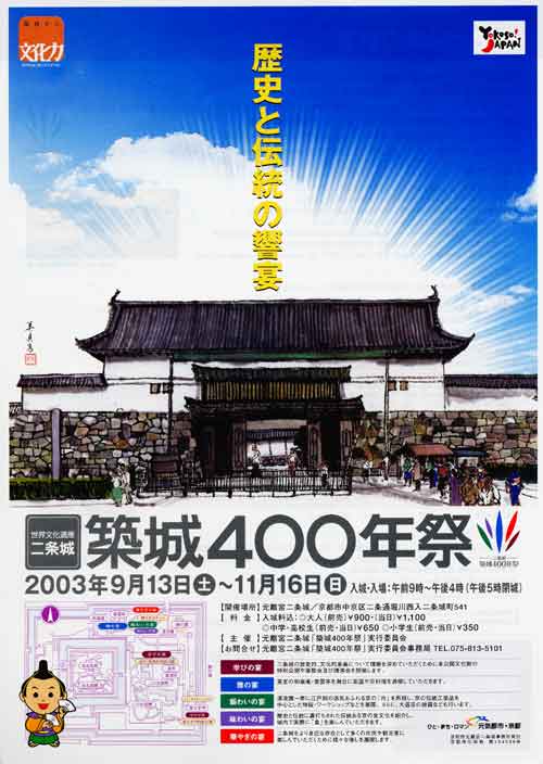 今日は晴。下は二条城(京都市)築城400年祭の案内。また"性格10類型による自己分析"だが、ざっとここで各タイプを説明しよう。先ず、躁鬱型・分裂型・粘着型、3者の中間にあるタイプから始めるが、おだやか型はおとなしくて現実的で受身。気遣い型は悲観的で敏感。安定型はおだやか型に近く、何処にいても目立たないが、知らぬ間に力を付けて皆の前を歩いている様なタイプ。安定型を"性格10類型による自己分析"はこう形容している。 ◆性格10類型を学んだ多くの人がこの安定型に憧れます。 躁鬱型は、大胆で朗らか、屈託のない楽天家であるほがらか型、逆にほがらか型の温もりを残しながらもおっとりとしていて粘り強いじっくり型、そのどちらの癖もない、優しさに満ちた温和型、そして躁と鬱の交替を特徴とする循環型と言う4つに細分化されている。そしてほがらか型から別れ出てはっきり躁鬱型とは別と認識出来るタイプには、義理人情的で強引、親分肌な強気型、さばさばとしていて短気、手際良いあっさり型がある。 分裂型は人間嫌い、冷ややか、理想主義的、形式的で余り感情を表に出さないが、無色な安定型に対して鮮やかな個性の色を有している。そして凝り性な熱中型、感情に蓋をしている無関心型、繊細緻密な内閉型、感情面で不安定で、「自分は誰」と言う疑問を抱いている敏感型、うっかり・勘違い・ぼんやりの多い停滞型に細分化されている。負けん気の強い目立ちたがり屋、天性の役者である顕示型は、分裂型から別れ出て独立したタイプ。 粘着型にも、躁鬱型に躁と鬱、分裂型に敏感と鈍麻があった様に、固執型と爆発型がある。固執型は固くとっつきにくく堅実で、食らい付いたら放さない亀の様な意志の持ち主。これと対照的に爆発型は誰とも付き合い、積極的だが柔らかさに欠け、力任せで強引。地道型は粘着-固執型に似て固い感じだが、"性格10類型による自己分析"は「まじめ」「几帳面」「執念深い」「使命感」なる表現を地道型にのみ与えている。こんな違いもある。 ◆共に融通性に欠け、臨機応変の動きは苦手ですが、その原因は、地道型の場合はソフトにあって、粘着型の場合はハードにある様な気がします。 ◆地道型の人達は時々袋小路に入り込んでもがき苦しみますが、粘着型の人達の場合は、袋小路に入っても殆ど意に介しません。余り、入り込んだと言う意識がないのです。何か、粘着型の場合、構造上、急にはどうにもならない仕組みがあって、慌てない様にも見えます。 やはりタイプが10もあるとその間の微妙な相違がはっきりしなくなる。固い感じだけを取り上げるならば、地道型と粘着型(特に固執型)だけではなく、分裂型もこれに該当する。 ところでそもそも筆者が"性格10類型による自己分析"を取り上げた理由は、分裂気質とスポーツとの関係に、丁度"THE ART OF USING YOUR WHOLE BRAIN"の証言を連想させる独自性を感じた為であった。次回はその中身、つまり分裂気質が必ずしも"THE ART OF USING YOUR WHOLE BRAIN"のFL+FRではないにしても、ある程度似ているタイプである事を指摘する。またまたMBTIの助けを借りるかもしれない。更に、「分裂気質」「躁鬱気質」「粘着気質」等同じ言葉で、或いは言い方は違っていても相当物であるとする前提の中で、全く違う性格描写がなされるのは心理学の常。何れ、この方向も少し探ってみたい。 | |