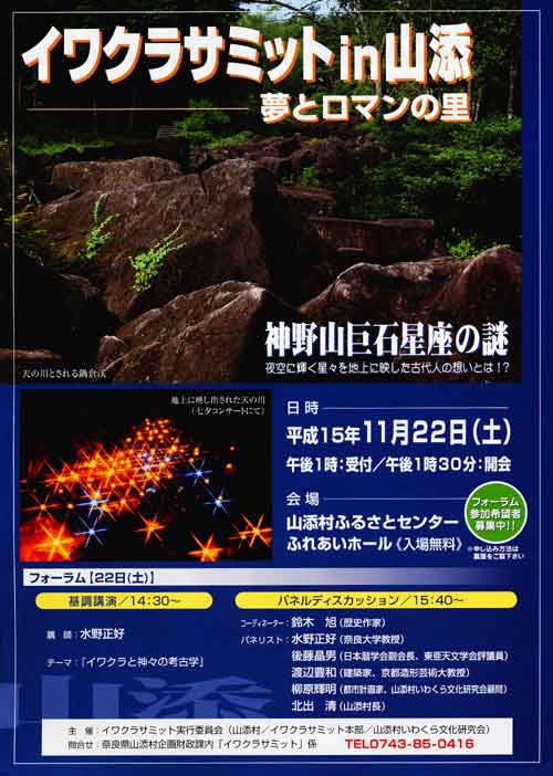 | 今日は久し振りの快晴。疲れた。下は"イワクラサミット in 山添"の案内。山添村で開催される講演会・ハイキングの様だ。 | |