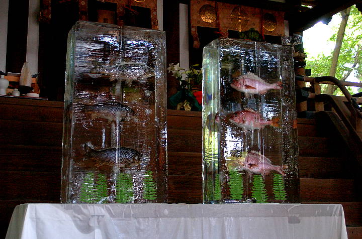 | 第1の話題だが、今日は好天に恵まれた為、掲題の如く氷室神社の献氷祭を見物。氷室神社は近鉄奈良駅から歩いて東大寺の少し手前にある、しだれ桜で有名な神社だが、製氷業界からの信仰も篤い。祭神はオオササギノミコト(仁徳天皇)·ツゲノイナキオオヤマヌシノミコト·ヌカタオオナカツヒコノミコト。そして祭りの進行手順だが、先立って本殿前に海の幸を代表する鯛を内包した氷柱が置かれる。そして午前11:00から祈祷の後、神饌と川の幸である鯉を内包した氷柱、そして大きい幣の奉納。本殿手前の舞殿では、蘭陵王の舞も行われる。そして午後2:00から舞楽があり、その後午後3:00頃から一般参詣者の協力を得て撤饌、つまり神饌や幣を片付ける行為を儀式化した所作。これには筆者も参加し、近くの依水園の入場券を貰った。依水園では今、ツツジが満開。下の写真は本殿前の鯉と鯛の氷柱だ。 | |||||||||||||||||||||||||||||||||||||||||||||||||||||||||||||||||||||||||||||||||||||||||||||||||||||||||||||||||||||||||||||||||||||||||||||||||||||||||||||||||||||||||||||||||||||||||||||||||||||||||||||||||||||||||||||||||||||||||||||||||||||||||||||||||||||||||||||||||||||||||||||||||||||||||||||||||||||||||||||||||||||||||||||||||||||||||||||||||||||||||||||||||||||||||||||||||||||||||||||||||||||||||||||||||||||||||||||||||||||||||||||||||||||||||||||||||||||||||||||||||||||||||||||||||