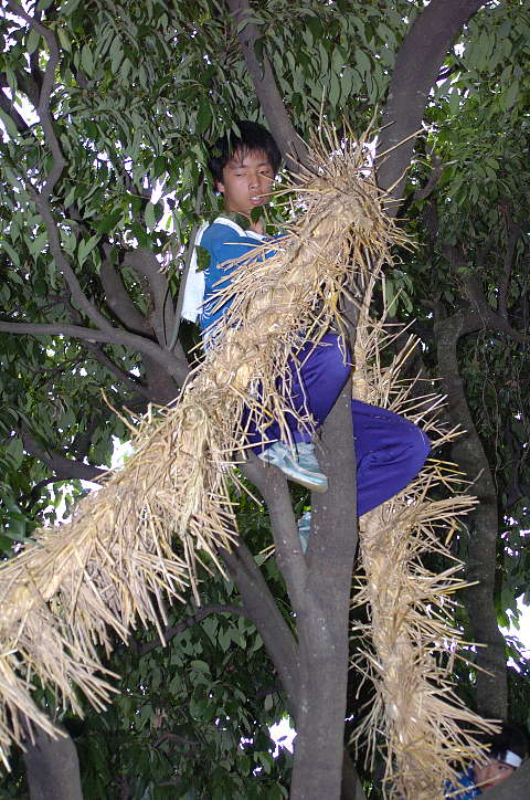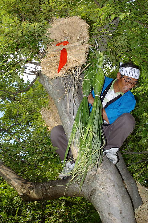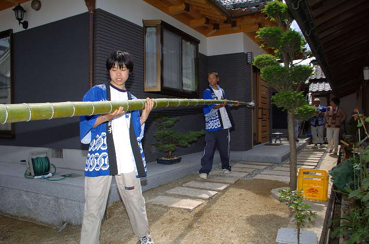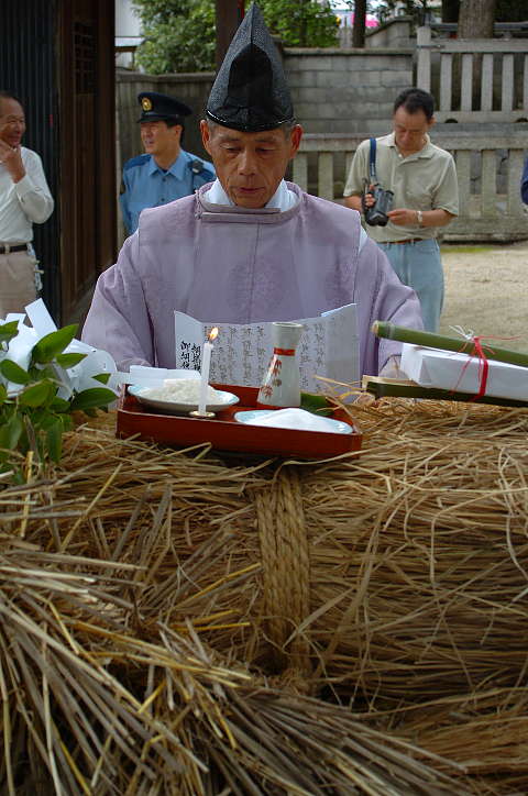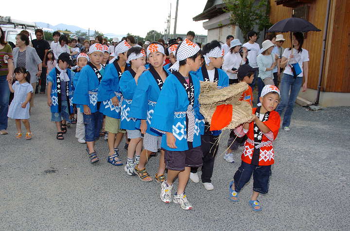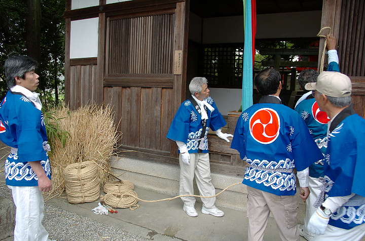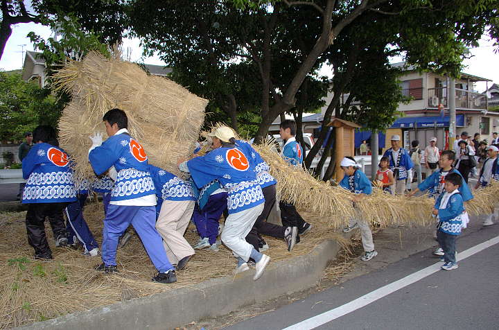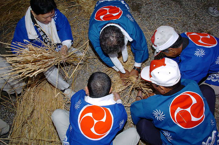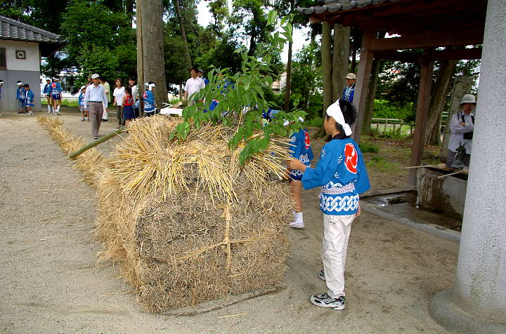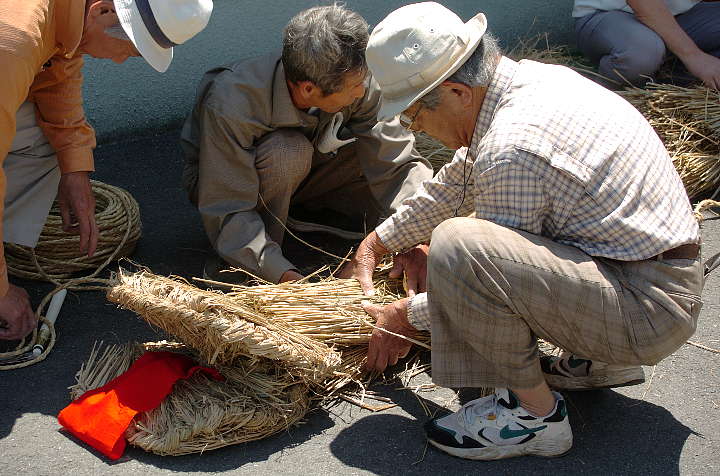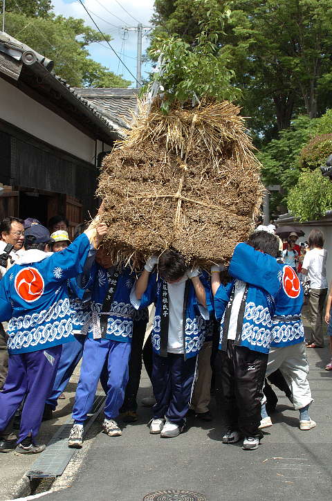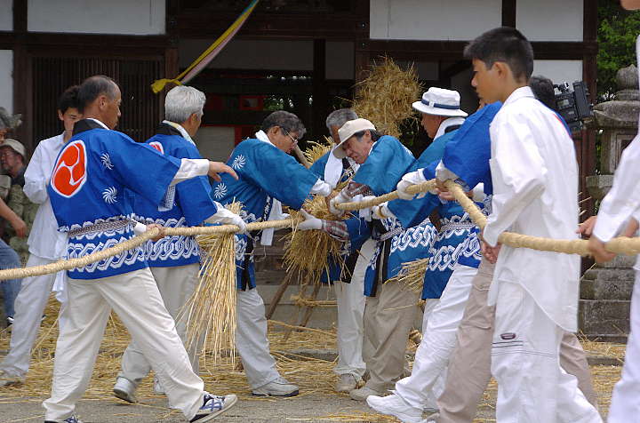 今日は雨後曇。巷ではNikon D2X(仮称)やCanon EOS-1Dsの次期型の噂が飛び交っているが、筆者は大阪市内へ行った帰り、Nikon D2Hを買ったカメラ屋を覗き、GITZOの三脚を見つけた。GITZOのホームページ http://www.gitzo.com を見てももはや出ていない百戦錬磨の老兵だが、脚の伸縮を止めるネジに羽が生えている大型。しかも、ロープロファイル雲台付き。2段目の脚を伸ばすと、ほぼ実用に足る高さになる。重さは雲台込みで7.5kg。これでもし不満があれば、天体観測用のピラー位しか選択肢がなくなる。さて、6/6は降水確率=40%〜60%となっていたが、田原本町今里·鍵の蛇巻きを見物。今里も鍵も近鉄橿原線·石見駅から東へ約1kmにある集落であり、同じ日に同じ題名の祭りが行われる。その内、鍵の蛇巻きから紹介しよう。
