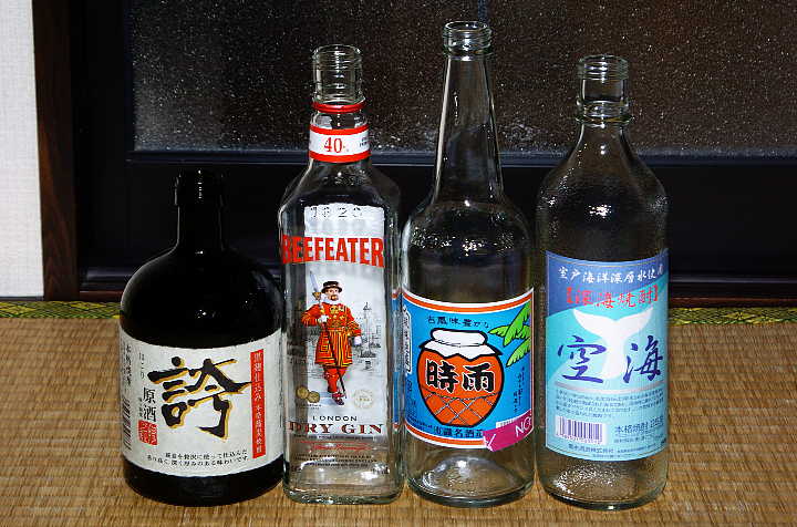 今日は曇後晴。下の写真は蒸留酒で、左から順に蕎麦焼酎「誇」(45%)、ジン「Beefeater」(40%)、泡盛「時雨」(30%)、麦焼酎「空海」(25%)である。筆者は時々こうした酒を呑んでぐっすり、寝る。こうして国家財政へもちょっと、カンパしてんだぞ、わっはっは。