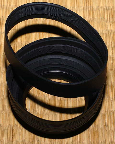それにしても筆者を含め日本人は平均して言えば、made in Germanyの称号のある製品に対して無条件の信頼を抱く様である。しかし写真用品に限って言えば信頼を裏切られた思いを抱く場合も少なくない。例えば下の写真にあるHamaのゴム製フード。広角から望遠レンズまで自在に適応出来る事が利点の筈だが、何と折り目で切れてしまった。そうでなくとも非対称性即ち成形精度の不足が目立つ場合もある。かかる問題は、厚み充分の日本製ゴム製フードでは先ず生じない。結局、50/1.4や35/2向けとしてHS-14を2つ、画角の狭くなるデジ1眼(Nikon D2H)と共用する場合を想定して、買ってしまった。