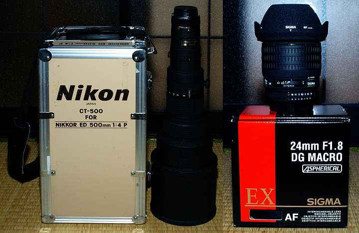 今日は曇時々雨だが、台風の為風も強い。毎年8/15に行なわれる"高円山大文字焼き"を撮るには、と題し今迄ずっと(超)望遠レンズの話題を出して来たが、その終止符が下った。右はSigma 24/1.8 DG Macro。DGとはデジタルを意識したレンズの意味だが、ともかくデジタル化に伴う広角レンズ群の弱みをどうにかするにはぴったりの製品だ。そして左はNikkor ED 500/4P。PとはAFではないが、AF化以降のカメラの測光機能にはほぼ完璧に連動出来る事を意味している。かつて(今でもそうだが)ニコンがキヤノンにAF技術で大きく負けていた頃の妥協の産物である。何れも中古。前者は梅田界隈の駅地下のA店で見つけた。後者はA店にあった2本と、そこから少し離れた西寄りのB店にあった1本の内、最も安いB店の1本である。最新のAF-Sの中古の約1/3と思われる値段だ。この500/4Pは、1.4倍·2倍のテレコンバーターを併用すれば700/5.6及び1000/8としても使えるから、筆者の要求仕様だった"800〜1200"の範囲にも入っている。だが誤算もあった。最近ニコンからx1.7倍のテレコンバーターも発売されており、筆者は先んじて買っていた。だがニコンのテレコンバーターはAF-S専用。どうやらマウントに特殊な突起がある様で、500/4Pを装着出来ない。やれやれ、AF-Sレンズを1本も持っていない筆者は、大損。おっと、1.4倍テレコンバーターも今日、買った。