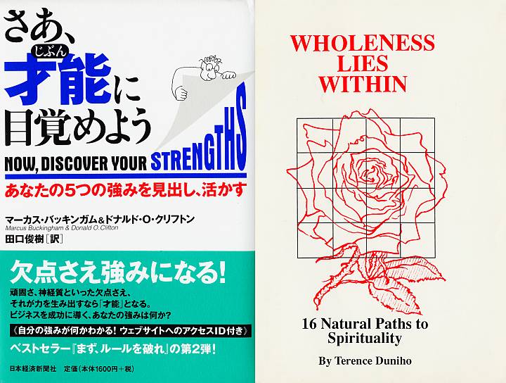 今日は薄曇。時々見掛ける洋物迷惑メールだ。 Return-Path: <kSuchan@ad-bargains.biz> Received: from ad-bargains.biz ([221.143.42.163]); Wed, 1 Sep 2004 18:40:56 +0900 (JST) (envelope-from kSuchan@ad-bargains.biz) From: "Be Your OWN Boss" <kSuchan@ad-bargains.biz> Received: from ad-bargains.biz [221.143.42.163] by 8v688.ad-bargains.biz with SMTP; Wed, 01 Sep 2004 02:37:54 -0800 Message-Id: <m7400w8b5r5.u5b4rv@ad-bargains.biz> Date: Wed, 01 Sep 2004 02:37:54 -0800 Reply-To: tMajerus@ad-bargains.biz X-UIDL: 6lR"!2P3"!p\U"!;T0"! X-NAS-Bayes: #0: 1; #1: 4.68288E-032 Subject: Spend more Quality time with Your Family X-NAS-Classification: 1 X-NAS-MessageID: 324 X-NAS-Validation: {3ED76BFB-4B37-45EC-95DD-10740EBCD4BF} Content-Type: text/plain; charset=us-ascii Content-Transfer-Encoding: 7bit -------- We can show you a way to earn more money sitting at h0me! Are you tired of working long hours? Do you want to stop paying interest and start saving money? Do you dream of buying a new car or taking a luxurious vacation? Or do you just want to spend more time with your family? How would you like to... - Make more money - Work when YOU want to - Spend more quality time with your family - Improve your standard of living Every week thousands of people say... "Enough is enough! I'm tired of living paycheck to paycheck. I want more out of life!" They decide to change their life, and live how THEY want to. You can too! This can be the first step towards living the lifestyle of your dreams. Let us show you how to take the first step today. Find out more information: http://ad-bargains.biz/?e= SLS Services, 1660 S. Church St., #131, Watertown, WI 53094 List Management Removal: http://ad-bargains.biz/out/?e= 最後に"Removal"とあるが、本当にRemovalしてくれるのか、信用出来ない。 さて今紹介するのはM. Buckingham & D.O. Clifton "Now, Discover Your Strength"の日本語訳"さあ、じぶん才能に目覚めよう"(左)とT. Duniho "Wholeness Lies Within"(右)だ。"さあ、じぶん才能に目覚めよう"はビジネスコーナーにあったが、要するに"アレンジ"や"運命思考"等34通りの能力の内、上位5つの優れた能力からどんな場面に自分が適しているかを考える手段"ストレングス ファインダー"の解説。洋物の故、能力を記述する言葉の意味する所と、日本語としての語感とに齟齬が生じる場合もある。例えば"慎重さ"はこんなだ。