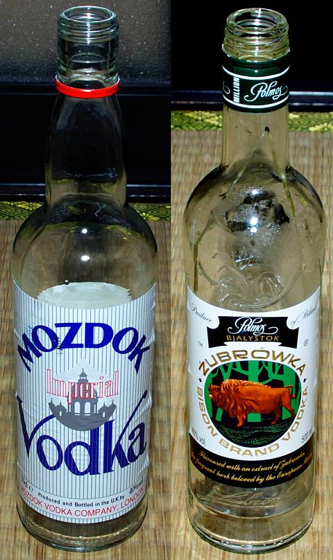 | 今日は曇時々雨。午後19:10と23:50頃、地震。左はMOZDOK(イギリス)、右はZUBROWKA(ポーランド)。MOZDOKは不純物の少ない、如何にもホワイトリカー的な西側世界のウォッカらしいウォッカだ。而るにZUBROWKAは所謂フレーバードウォッカ。桜餅の香りだ。 | ||