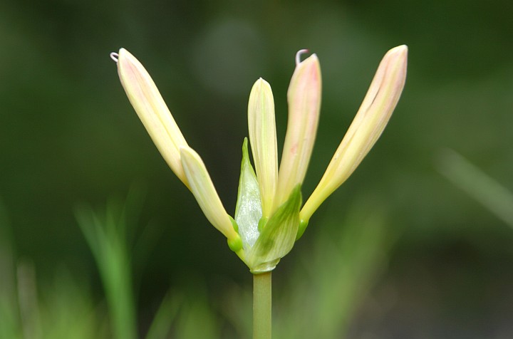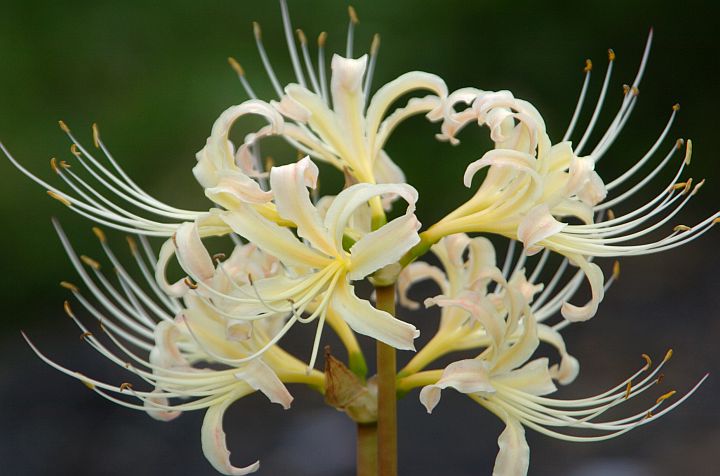 | 今日は薄曇。昨日蕾だった白い彼岸花が、もう咲いている。 | ||