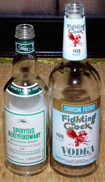 | こちらはウォッカ。左はポーランドのスピリタス(Spiritus)。アルコール濃度96%で有名。かぼす酒作りに際し、ホワイトリカーに追加し、アルコール濃度を上げた。右は余り聞き慣れぬ品名だが、アメリカのファイティングコック(Fighting Cock)。アルコール濃度51.5%。呑んでしまった。 | ||
