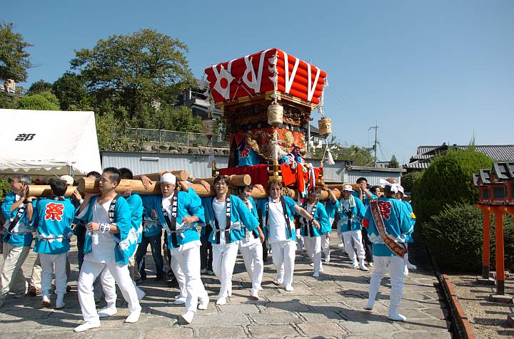 | 今日は10月らしからぬ、刺す様な厳しい快晴。近所で布団太鼓の祭りがあった。地区毎に動いた様だが、下の写真はその内の1台、疋田区の布団太鼓。 | ||