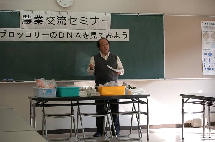| 今日は晴。ここ数日、ぐっと寒くなった。既に述べた様に11/28、筆者はばぁさんと、一般民を対象とした奈良県農業技術センター(橿原市)の"農業交流セミナー"に参加した。ここではその前半、ブロッコリーのDNA抽出の話題を出そう。下の写真は農業技術センターの表札と、セミナー会場だ。 | ||