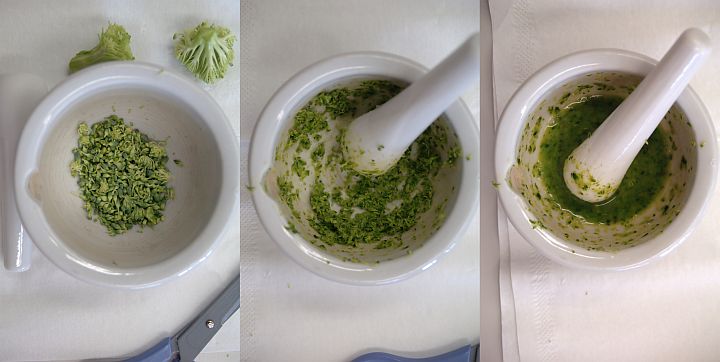 | ブロッコリーの花(プチプチとした部分)を切り取って乳鉢に入れ(左)、すりこぎでドロドロになる迄擦り潰し(中)、DNA抽出液を加える(右)。そして約5分、待つ。 | ||
