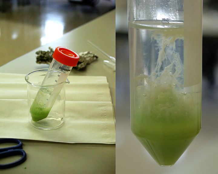 | 乳鉢の中身を茶漉しで漉して試験管に移し、エタノールを加え、暫く待つ(左)。そうすると浮いているエタノール側に白いもや状の物質が沸き出始めるが、これがDNAだ。 | ||