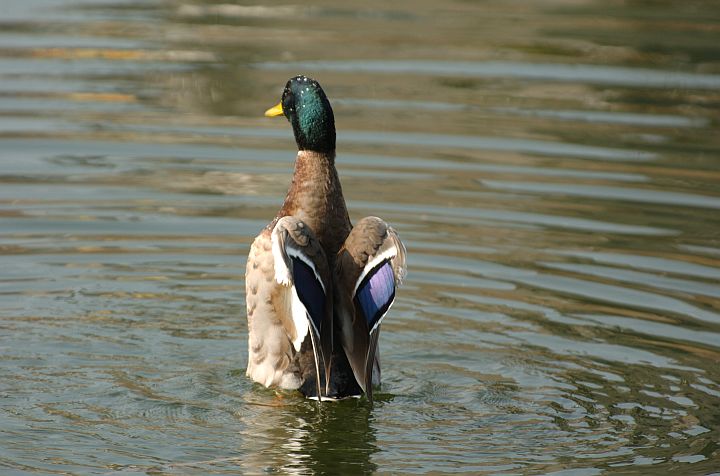 | 今日は晴。近所の池で夏を過ごした鴨が羽ばたき始めた処。実はこの少し前から水を自分の体に掛けたりしていた為、この段階で筆者のカメラ(Nikon D2H)のバッファが一杯になってしまった。やれやれ。 | ||