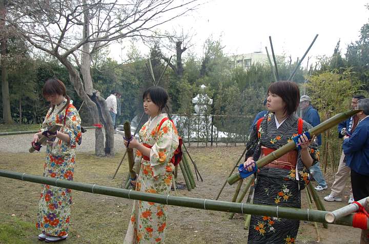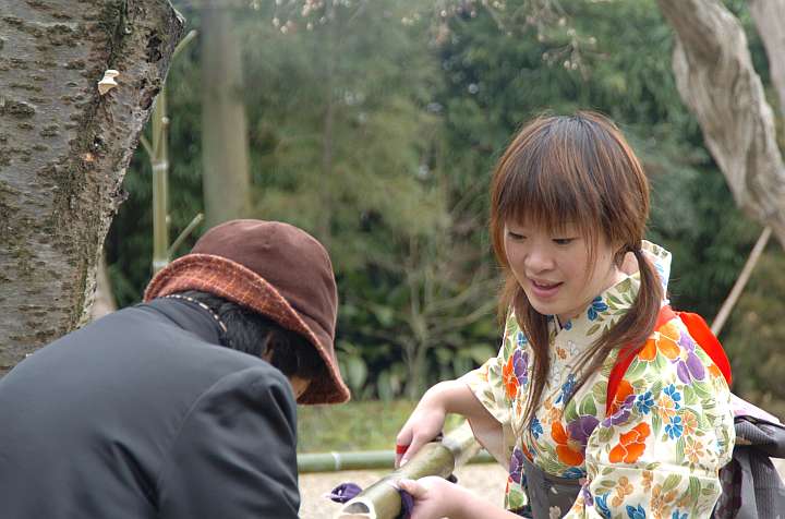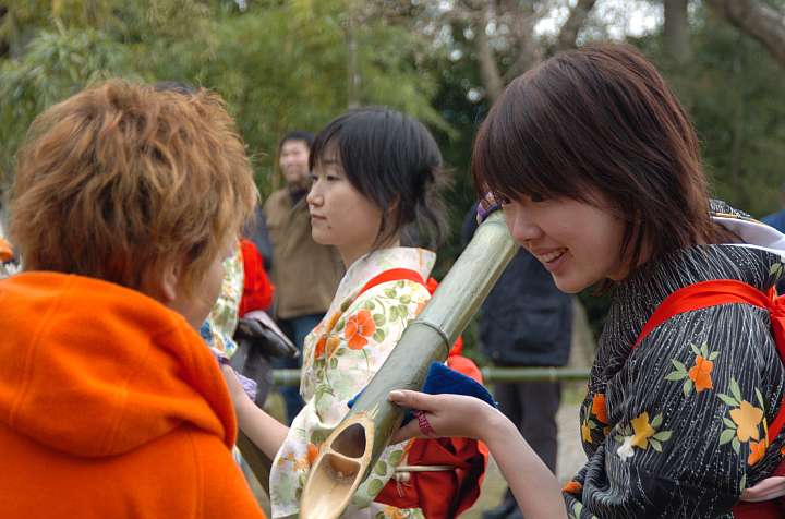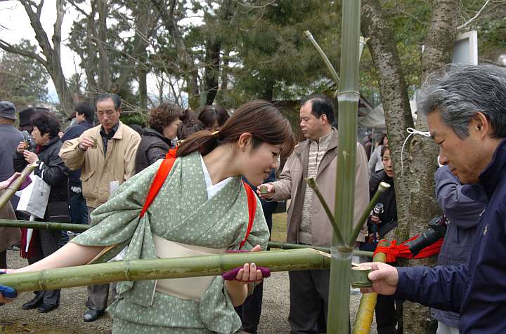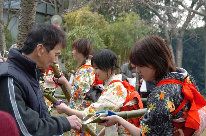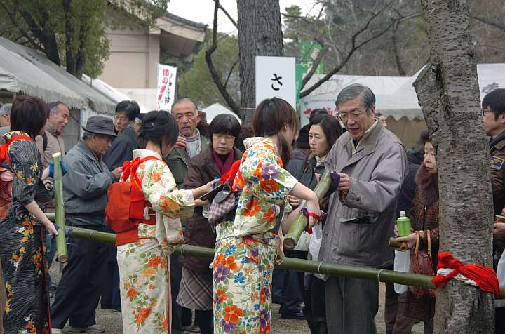 | 関西は雨、関東は晴。大安寺·光仁会の続き。若い女性が参詣者に笹酒を注ぐ。 | ||
