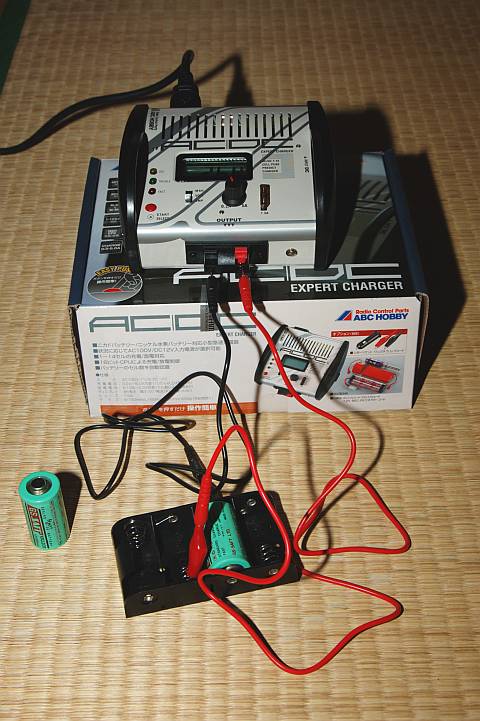 | 充電中。充電の対象となる電池は単2型Ni-Cd電池(容量2200mAh)。昨日触れたストロボ外部電源用だ。しかし、400〜500mAhで充電完了になってしまう。久し振りに充電した為か、それとも充電による電圧変化にも相性問題がある為か。 | ||