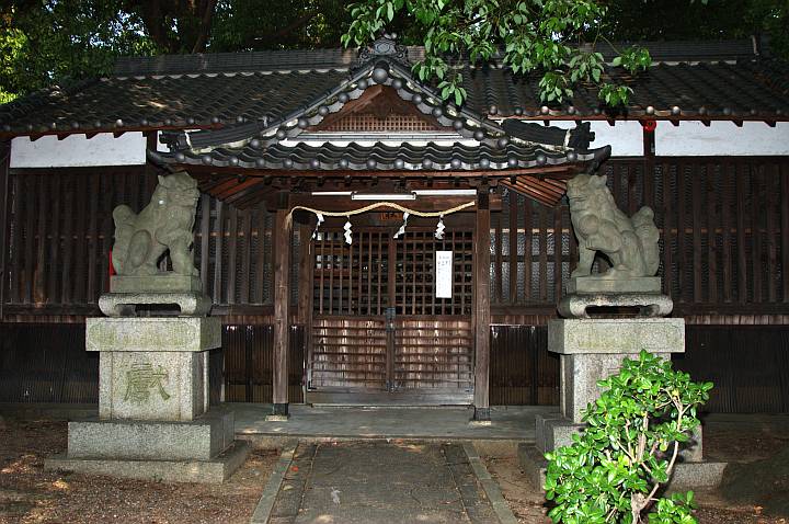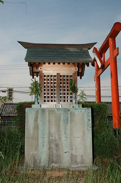 | 南側には小さな祠。背後には赤い鳥居が見える。 | ||