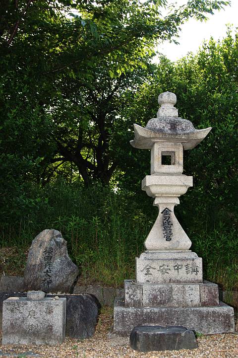 | 来た道を少し戻るとここにも。右の石灯篭には"金刀比羅宮"、左の石には"猿田彦大神"とある。 | ||