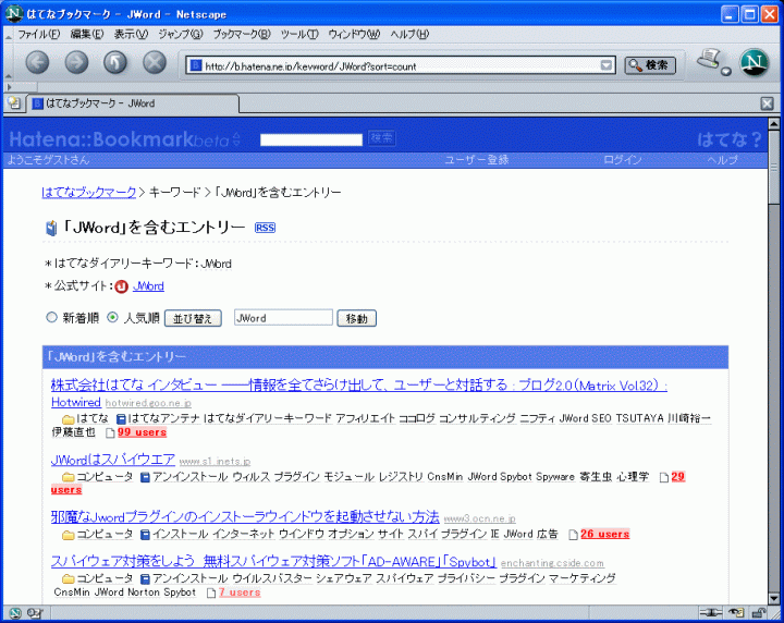 | これはgoogleで"jwordはスパイウエア"と打ち込むと(""付きに注意)出て来る事で分かるが、実は、何と日記系ホームページの大手であるhatenaの「JWord」を含むエントリーhttp://b.hatena.ne.jp/keyword/JWord?sort=countで2位になっている事を発見(下図)。 | ||