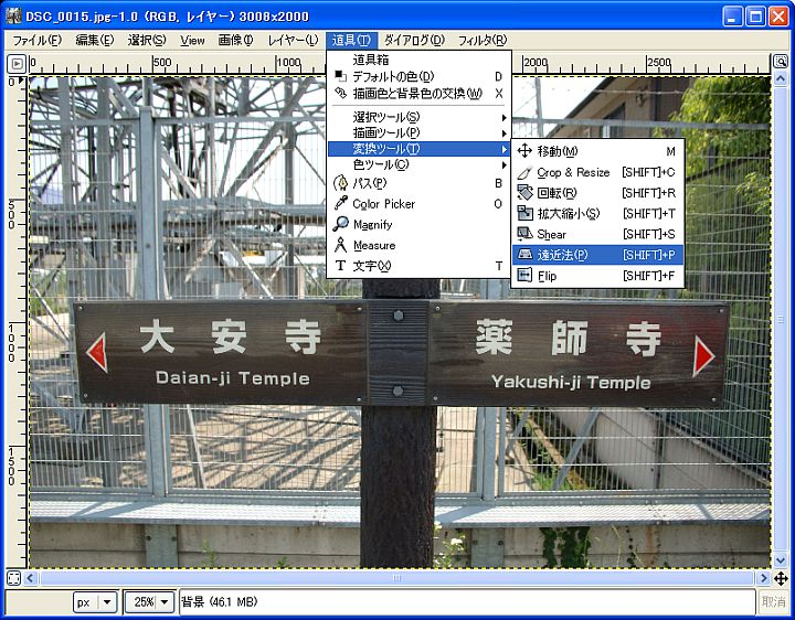 | その為には、道具==>変換法==>遠近法を選択する。 | ||||||||||||||||||||||||||||||||||||||||||||||||||||||||