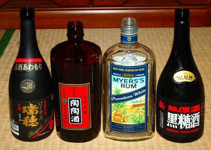 | 今日は晴。左から泡盛、薬用酒、そしてラムが2種類。 | ||
