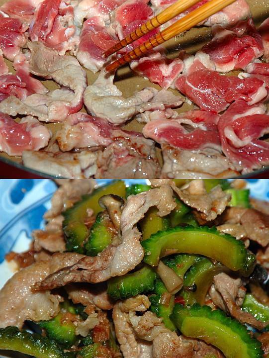| 今日は晴時々曇。疲れた。下の写真は苦瓜と豚の炒め物。 | ||