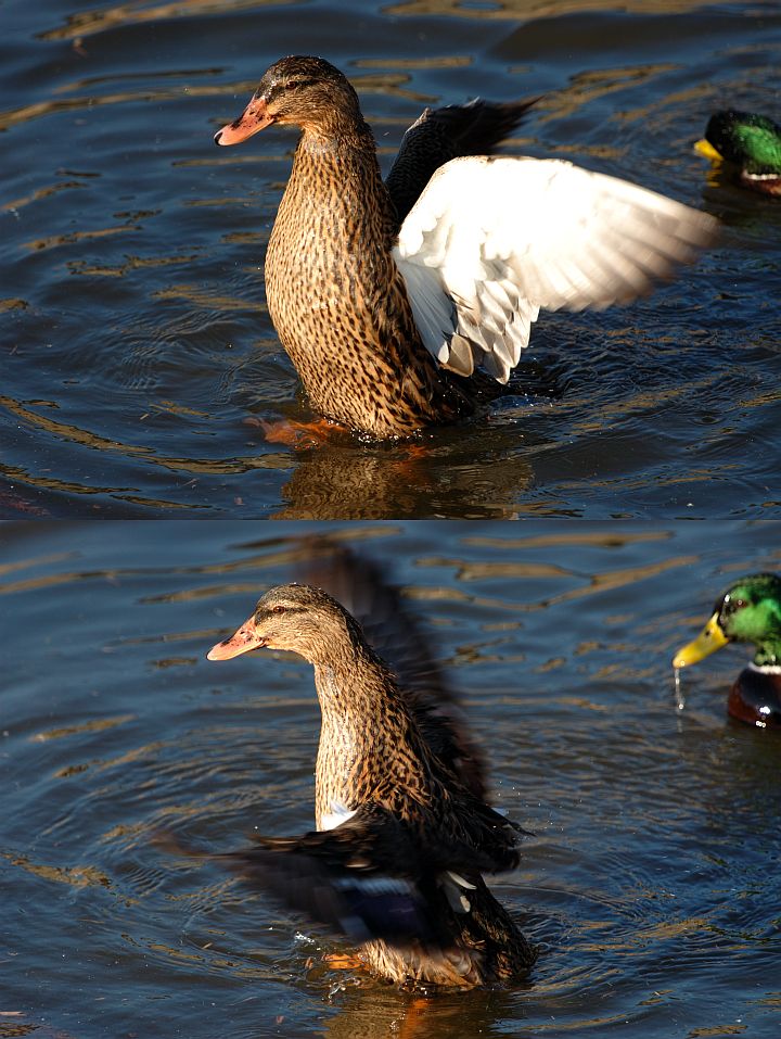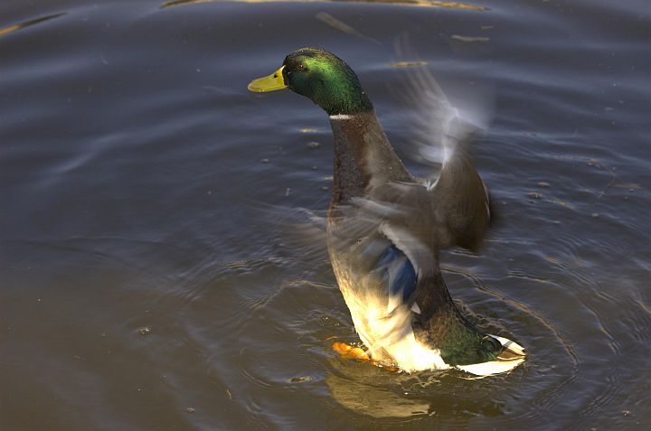| 今日は晴。ガラスや紙パックの様な資源ごみの回収日。下の写真の様に、マガモは時々水上で羽ばたく場合がある。 | ||
