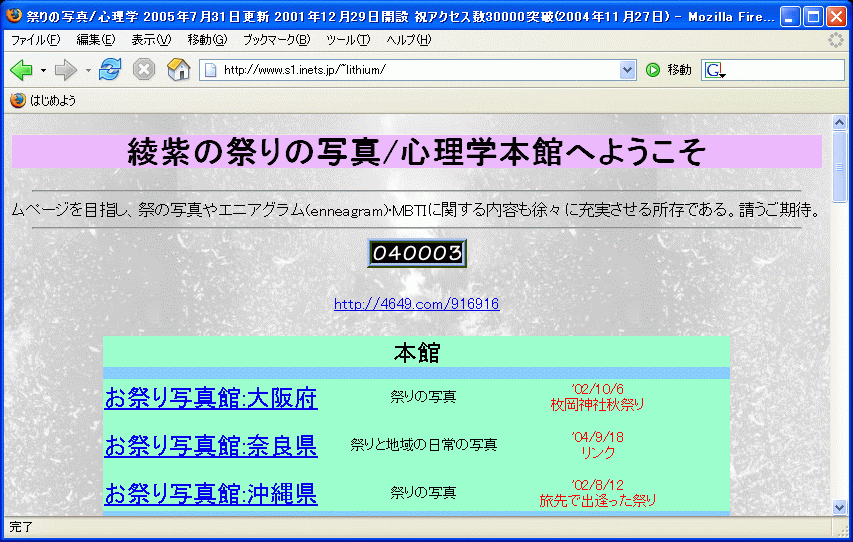 | 今日は晴。疲れた。筆者の本館(http://www.s1.inets.jp/~lithium/)へのアクセス数が今日、4万を超えた。 | ||