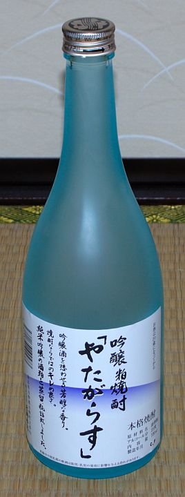 今日は晴後小雨。下の写真はやたがらず(吟醸粕焼酎)。吉野の北岡本店(http://www.kitaoka-honten.co.jp/)の製品。