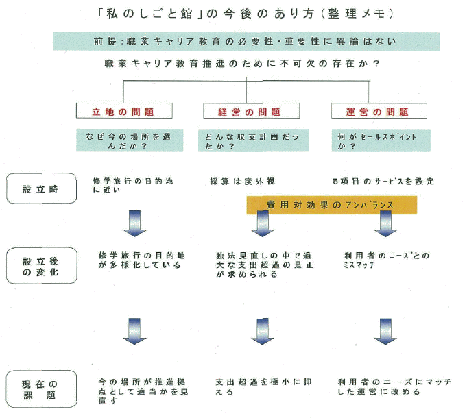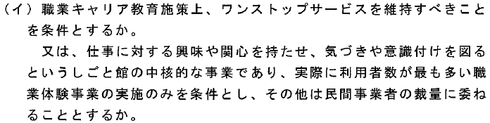 | こっちもひどい。私のしごと館の民間委託に関する条件を話し合った際の意見のまとめだが、職業に関する疑似体験教育を「興味や関心」「気付きや意識付け」「中核」「利用者数が多い」と自画自賛している。初めから私のしごと館が疑似体験館だった事は事実だが、本当に「中核」「利用者数が多い」と主張出来る為には競合する他のアトラクション、例えば道の向かい側にあるけいはんな記念公園に勝ってそうなった事を証明しなければならない。 | ||