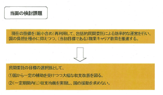 の帳簿価格に従えば18億円で、建設費580億円を取り返すには至らない。 となれば現状の建物を活かしたまま、現状の疑似体験等のサービスを停止し、けいはんな精華·西木津地区に於いて許される活動を行う企業や研究機関、大学等に賃貸するのが現実的かもしれない。但し、(株)けいはんなの現実を考えれば、賃貸を選んでも茨の道が続くだろうから、これ以上雇用保険に穴を開けない、投資用語に於ける所謂"損切り"の為には、やはり完全に手放すのが賢明かもしれない。 だが引っ掛かるのは、22日に述べた様に、厚生労働省が私のしごと館を廃止する代償として、類似の施設を各地に展開する可能性をも示唆している点。無駄の上塗りだ。これに対抗する為には、職業キャリア教育の縮小を許す様な政策上のバックアップも必須だ。 | ||