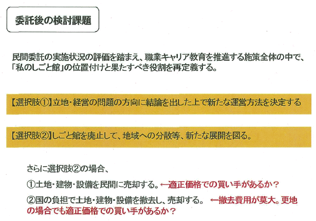 | そして問題はこちら。私のしごと館の問題点として広く客を集めるには相応しくない不利な立地条件がある事は確かだ。私のしごと館の場所、けいはんな精華·西木津地区は現在、さすがに開闢当時のままの田舎ではないが、郊外の"台"や"ヶ丘"が付く街の1つ。積極的に他所から人が集まる場所ではない。pdf資料はこれを逆手に取って、現在の私のしごと館を潰すなら、これに代わる施設を各地に作る可能性を示唆している。恫喝だ。 | ||