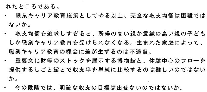 こちらは民間委託に際して収支目標をどう設定すべきかに関する話し合いで出た意見のまとめだが、親の所得に関わらず職業キャリア教育を施す事が理想だと思っている様子だ。馬鹿馬鹿しい。今、主要教科に於いてはゆとり政策の影響で相対的に塾の力が増し、親の所得格差に起因した教育格差がまた所得格差を再生産するのではないか、とする懸念がある。実際昔から、東大出身者の親の年収は高いと云われ続けて来た。こうした現実は、藩閥に囚われず広く、差別を廃し人材を募る手段として学歴を掲げて来た明治維新以降の日本の国是(学歴主義にも問題はあるが)にも反している。だから職業キャリア教育の機会を云々する余裕があるならば、主要教科の対策をもっと優先して考えるべきだ。 それにしてもお役所には全くしおらしさも、国全体の課題を踏まえて物事の軽重を判断する大局観もない。こんな調子だから、私のしごと館は罰として廃止すべきだと思ってしまう。 | ||