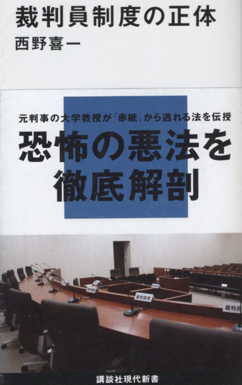 | 今日は昨日からの雨が弱まり、薄曇。私のしごと館が目指している"職業キャリア教育"以上に目的が不明な国の事業、それが裁判員制度だ。裁判員制度に対して意見を述べる個人の例に違わず、筆者も裁判員制度には反対だ。筆者は法律には疎いので、裁判員制度が裁判をどう良い、或いは悪い方向に変えて行くか想像すら出来ないが(だが何となく後者に1票)、少なくとも運が悪ければ裁判員に選ばれるかもしれない弱い一介の庶民として、裁判員制度には反感を抱かざるを得ない。こうした状況で頼もしいのが西野喜一著"裁判員制度の正体"(講談社)だ。 | ||