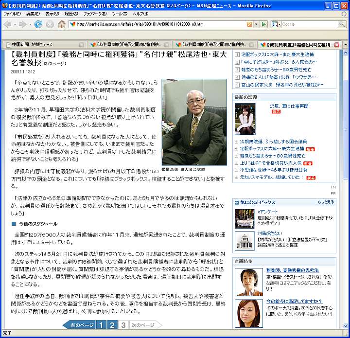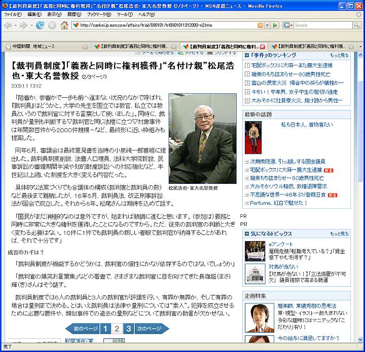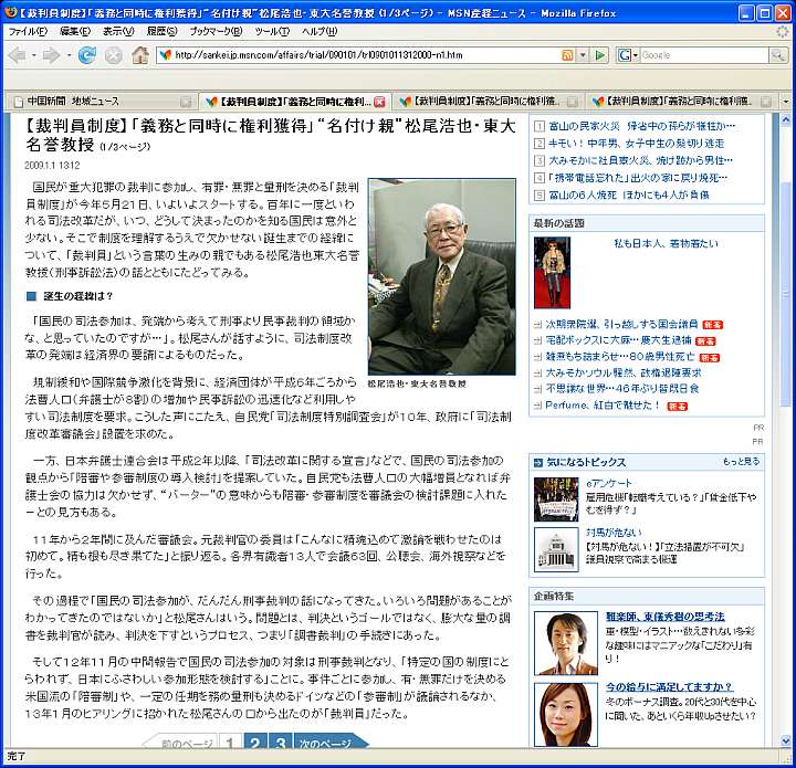 続いてMSN産経は裁判員制度誕生の経緯に関し、「裁判員」という言葉の生みの親でもある松尾浩也東大名誉教授の言葉を引用しつつ、触れている。