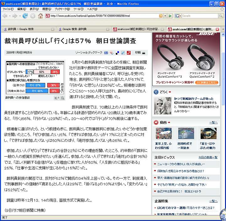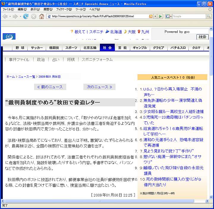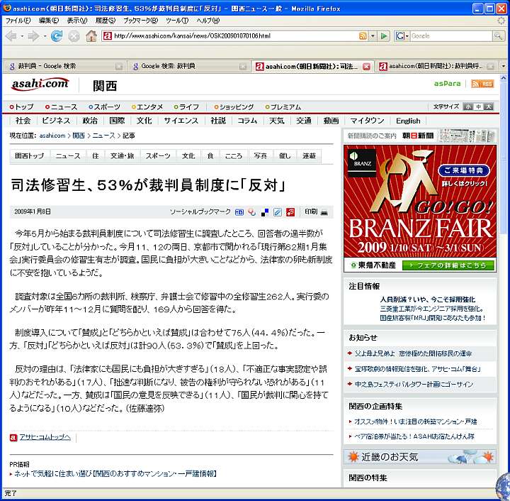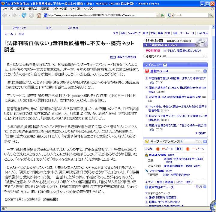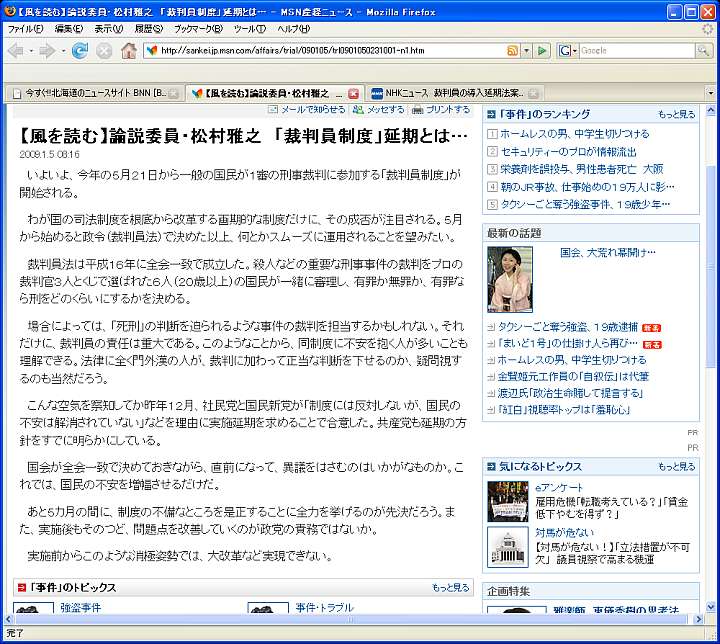 如何にも裁判員制度を考え出した側らしい発言である。余程、自己防衛しているのか、本当に世間知らずなのか。第1に「国民がまだ消極的なのは意外ですが」とあるが、裁判員制度には不慣れな業務への強制徴用としての側面がある以上、嫌がるのが世間の常だ。なのに意外とは、まさに市民感覚の欠如。第2に「従来の裁判官の判断と大きく変わる必要はない」とあるから、もし本当にそうならば、裁判員制度は結局、従来の本職の裁判官の判決に庶民も参加した逃げ口上を与える物でしかなくなる。第3に「10件に1件でも裁判員の新しい着眼で裁判官が納得することがあれば、それで十分です」とある。ここからは、従来の判決には約10%、誤審·冤罪があったのではないか、と云う疑念が想像出来るが、「新しい着眼」と云う表現からはそこ迄の深刻さは感じない。結局裁判員制度は単なるバーター取引の結果であって、裁判を改善する為の制度ではない、と思えて来る。第4に順序は前後するが「義務と同時に非常に大きな権利」と云う部分の権利が何か、具体的ではない。本気で裁判員制度を権利として運用するならば、所謂当事者(原告·被告)の関係者·支援者を登用するとか、何でも口を突っ込みたい、即ち誰でも死刑とか、検察のやる事は皆横暴だから今度も無罪とか主張したがる無茶な人々を積極的に登用するとか、最近の派遣切りで影響を蒙った人々を優先して登用するとかを考えるべきである。更にそうした配慮に実効性をあらしめる為、志願制を採用するならなお望ましい。逆に筆者の様な見識のない庶民は権利とは感じないから、裁判員になりたいと思う場面がもしあるとすれば、それは職に困った時だけである。