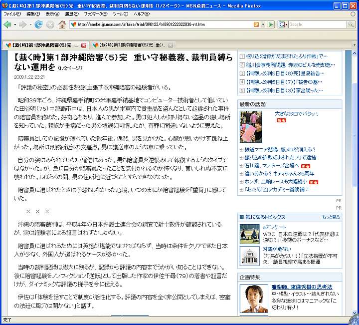 またMSN産経を取り上げる。裁判員制度に対する反対理由の1つとして被告(やその他関係者)からの報復が挙げられる。沖縄ではアメリカ占領下で陪審制による裁判が行われていたらしいが、