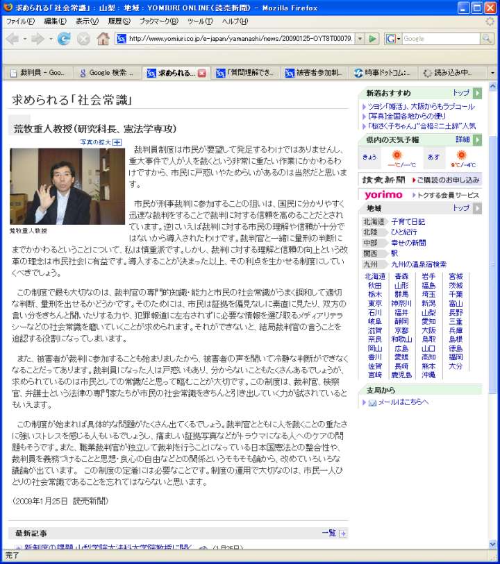 先ず読売。荒牧重人教授(研究科長·憲法学専攻)の裁判員制度に関する意見を掲載。山梨県の地方版なので、山梨大の教授だろうか。