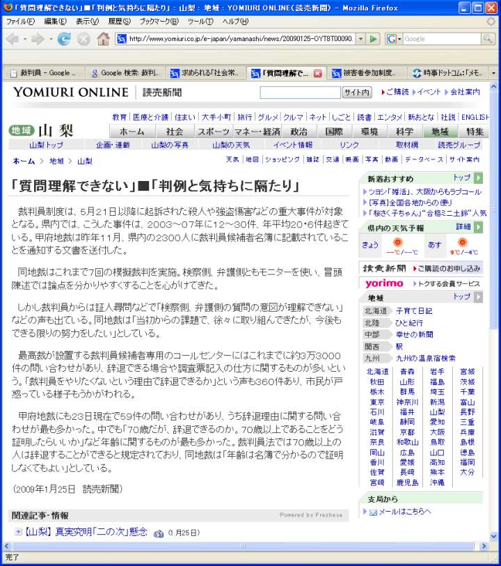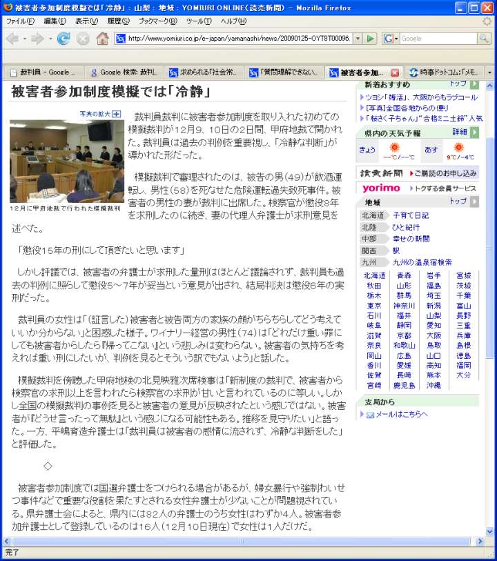 また読売の山梨県版。山梨地裁では裁判員制度の開始に備え、模擬裁判を実施して来たが、