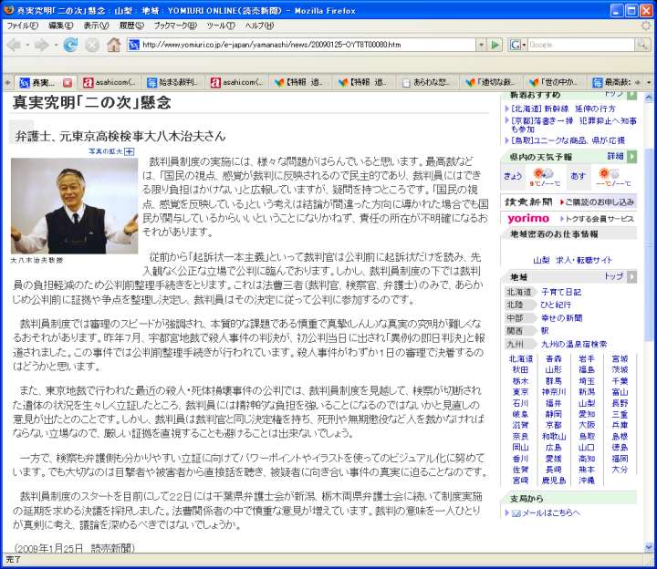 昨日に引き続き読売の山梨県版。弁護士(元東京高検検事)大八木治夫の裁判員制度に関する意見を掲載。