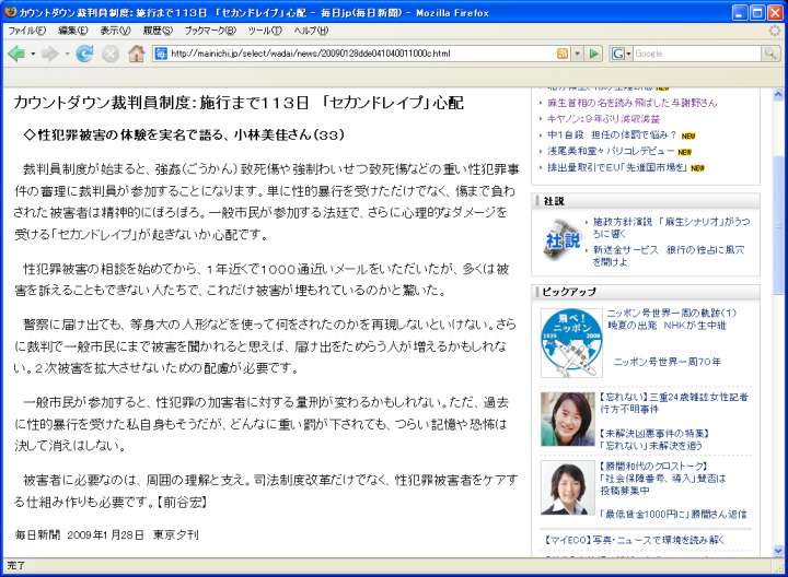 毎日は「セカンドレイプ」と云う言葉で裁判員制度の課題を指摘している。強姦致死傷罪や強制猥褻致死傷罪は重大犯罪として裁判員裁判の対象になるが、そうすると被害者は素人の前で証言せねばならなくなる。素人裁判員がアダルトビデオを見る様な興味津々と云った目付きで被害者を視姦······これは西野喜一「裁判員制度の正体」も指摘する裁判員制度の陰の側面だが、こうしてマスコミが取り上げたのは何の対策もないからだ。実施に向け、勝手に進む裁判員制度。